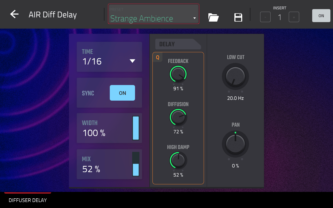 Instead of adding reverb into your chain, use Diffuser to dial in the perfect diffuse amount creating space and ambience for your delay tails.
