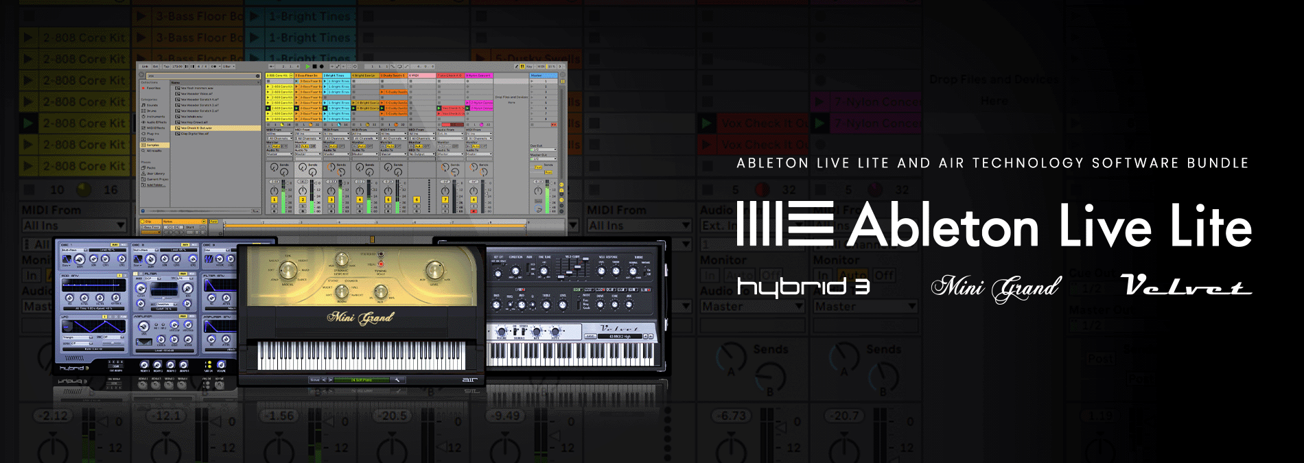 APC Mini mk2 includes Ableton Live Lite software with all the tools to transform your musical ideas into exciting songs and performances. APC Mini mk2 also includes multiple world-class plugin instruments from award-winning sound design company AIR Music Technology including Hybrid 3 — a powerful polyphonic analog synth, Mini Grand — an acoustic piano instrument, and Velvet — a vintage electric piano instrument.