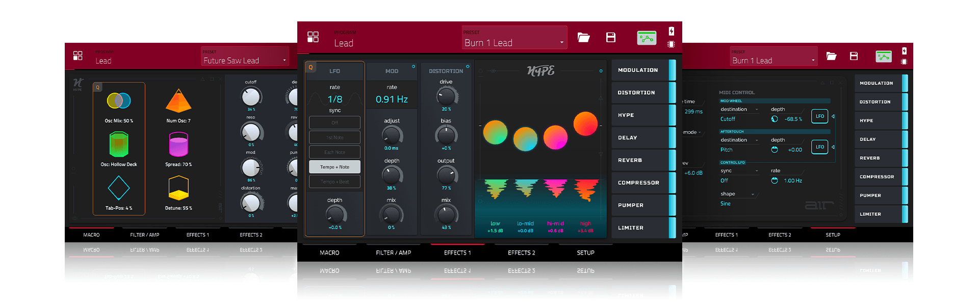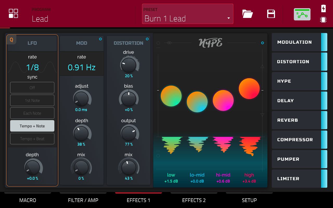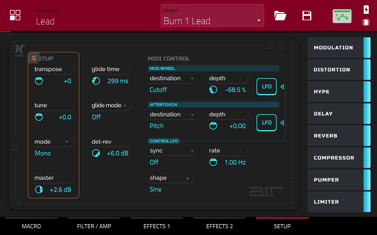 AIR Hype has world-class audio effects processing built-in to quickly enhance your sounds as you create. Choose from Modulation, Distortion, Hype (EQ), Reverb, Delay, Compressor, Pumper and Limiter, each with its dedicated section to dial-in any adjustments. The Effects panel is intuitively displayed on every page of AIR Hype to conveniently enable or bypass each of the 8 effects at any time.