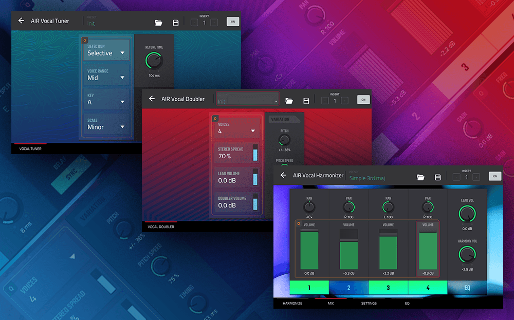 A first of its kind plugin collection for standalone music production devices, the new AIR Vocal Insert Effects Suite delivers advanced vocal processing to achjieve innovative vocal textures, harmonies and more for an ultra-modern approach to songwriting, composition, performance and production. This 3-plugin suite includes versatile pitch correction, vocal doubling and layering, as well harmonizing tools, empowering composers and songwriters the ability to achieve virtually any kind of vocal sound right from the standalone MPC devices.