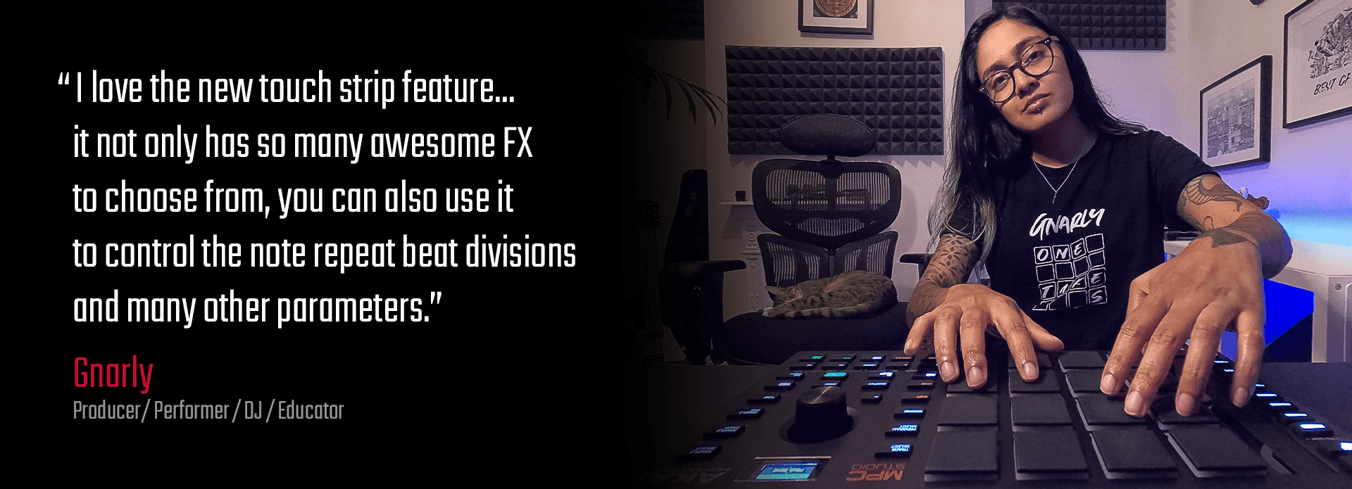 Make sounds your own with the assignable Touch Strip. This fluid controller bends and shapes your sounds however you want. Make that pad synth more mysterious with a swell, control the roll of your hi-hats to fill your trap drumbeat, or make that guitar part more realistic by articulating the strum right where you need it. Assign any of the numerous knobs, sliders, and parameters to the Touch Strip for new and inventive manipulation of any track.