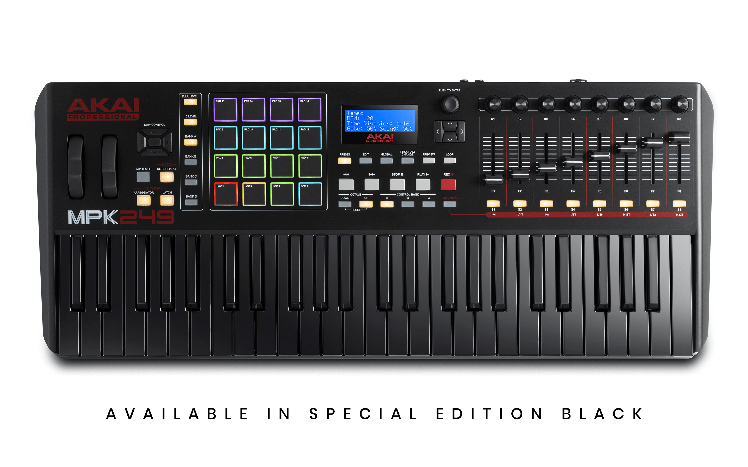 Engineered to be an all-in-one controller solution, the Akai Professional MPK249 is a performance pad and keyboard controller that combines deep software integration, enhanced workflow, and core technologies from the iconic line of MPC workstations. Each member of Akai Pro's MPK series comes fully loaded with a comprehensive interface for manipulating virtual instruments, effect plugins, DAWs, and more. MPK249 features 49 semi-weighted keys with aftertouch, 8 assignable knobs, faders, and switches, 16 MPC-style pads with RGB feedback, and onboard transport buttons. Three banks expand the number of knobs, faders, and switches (up to 24 each), and four pad banks expand the number of pads (up to 64 total). Plus, MPK249 is optimized to interface directly with your Mac or PC with USB power and plug-and-play connectivity.